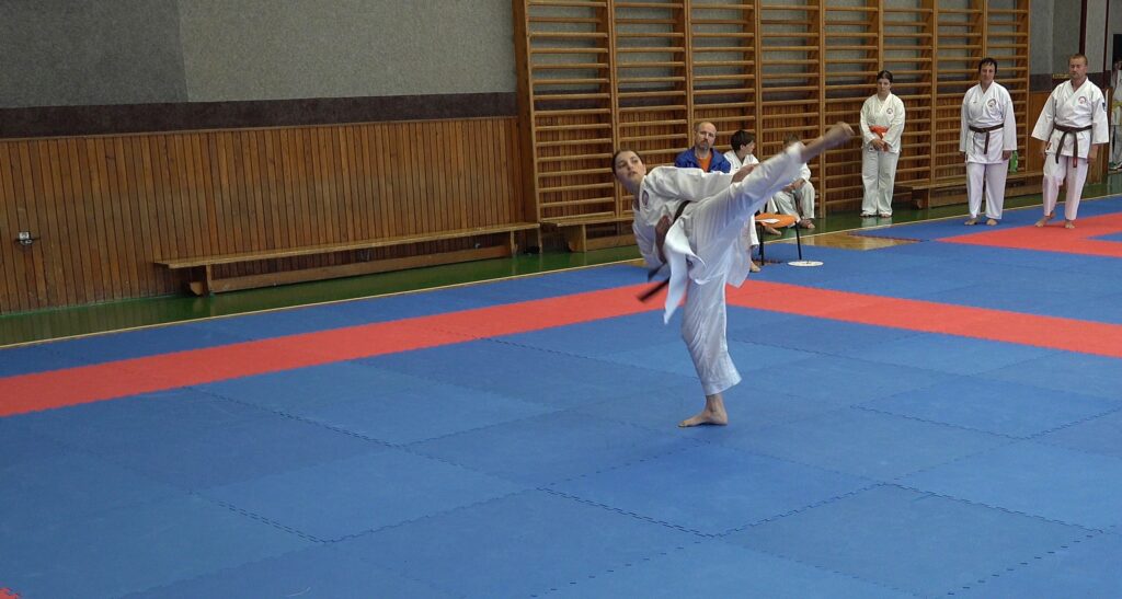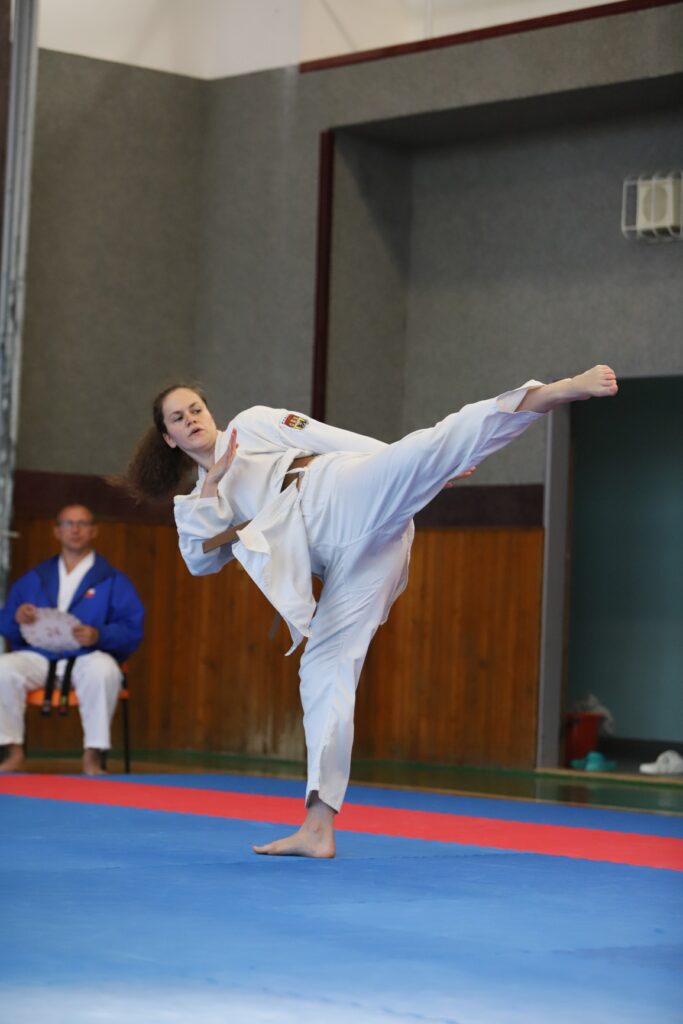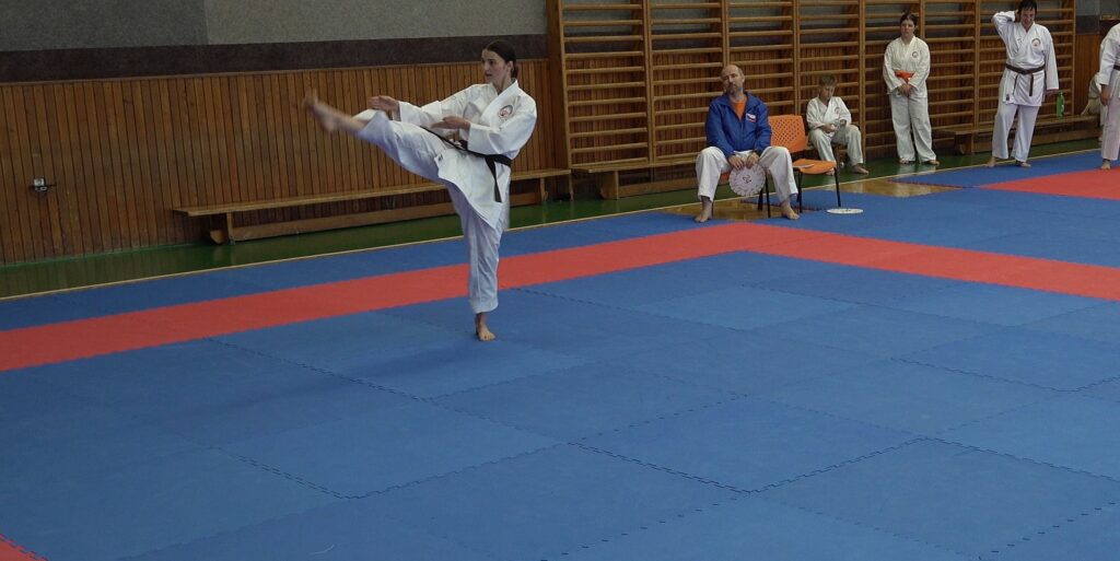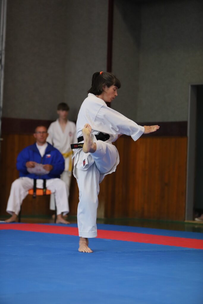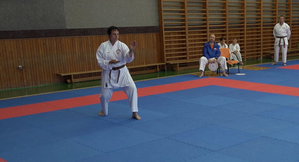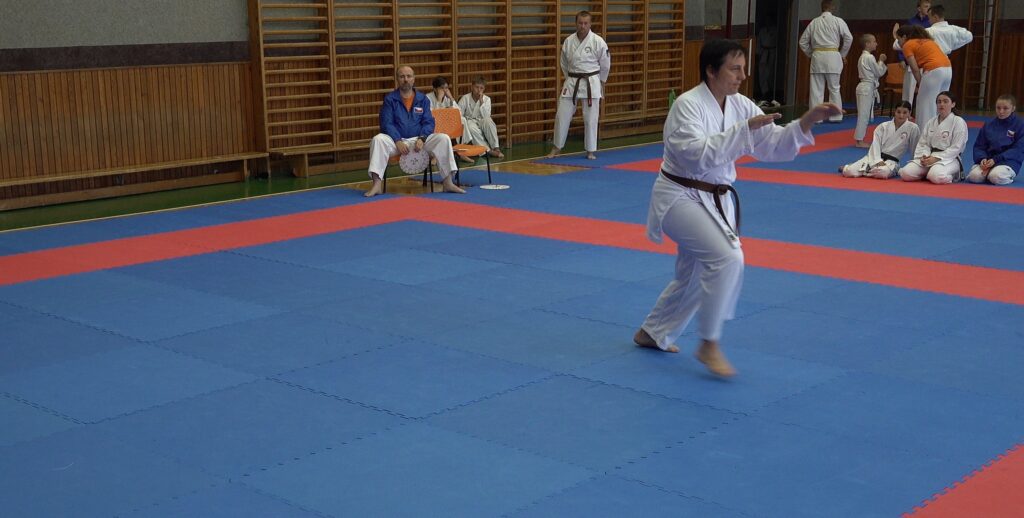 Druhou závodnicí byla Alena Bajerová z oddílu Zábřeh na Moravě, favoritka této kategorie. A skutečně formu Primu vystřihla jedna báseň. Forma Secunda byla technicky skvělá, včetně bojového nasazení a dynamiky. Tohle posunulo kvalitativně laťku ostatním trochu výše. V další formě Terca se objevilo jedno malinké zaváhání, které ovšem ostřílená závodnice dovedně kompenzovala a necvičené oko by si toho sotva všimlo. Kondice této závodnice je skutečně velmi vysoká a tak drží vysoké nasazení i ve formě Quarta. V poslední nejnáročnější formě Quinta jsme viděli dvě drobné chybičky, ale celá sestava byla předvedena ve vysokém nasazení s jinak perfektní technikou. Tohle je jednoznačně kandidátka na vysoké umístění.