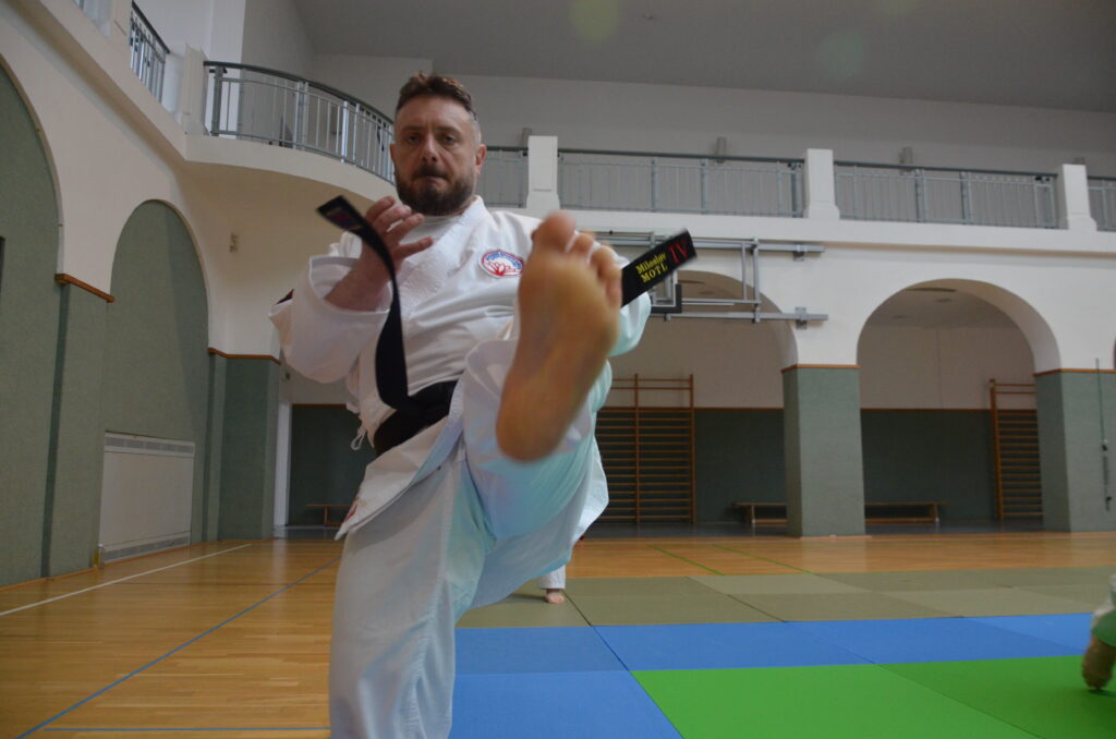Středu jsme započali stejně jako den předešlý a pustili se do toho s plnou parádou. Tentokrát jsme „nakouslé“ obloukové kopy z přechozího dne prohloubili a mrskali je na hlavu soupeře jedna báseň. Využívali jsme různé variace přiblížení, jako jsou například přískoky, přeskoky na místě a náskoky. Přišel další blok pádů, které nás zase připravily a nažhavily na podmety v klinči, tělo na tělo. Mistr Issa předvedl vše velmi elegantně a bez námahy a jak to vždycky bývá, my jakožto žáci jsme elegantní moc nebyli. Ale čím víc jsme to zkoušeli, tím lépe nám to šlo. Zakončením technicko-taktické části nám byl progresivní sparing a příprava na turnajové formy.
